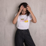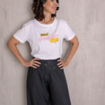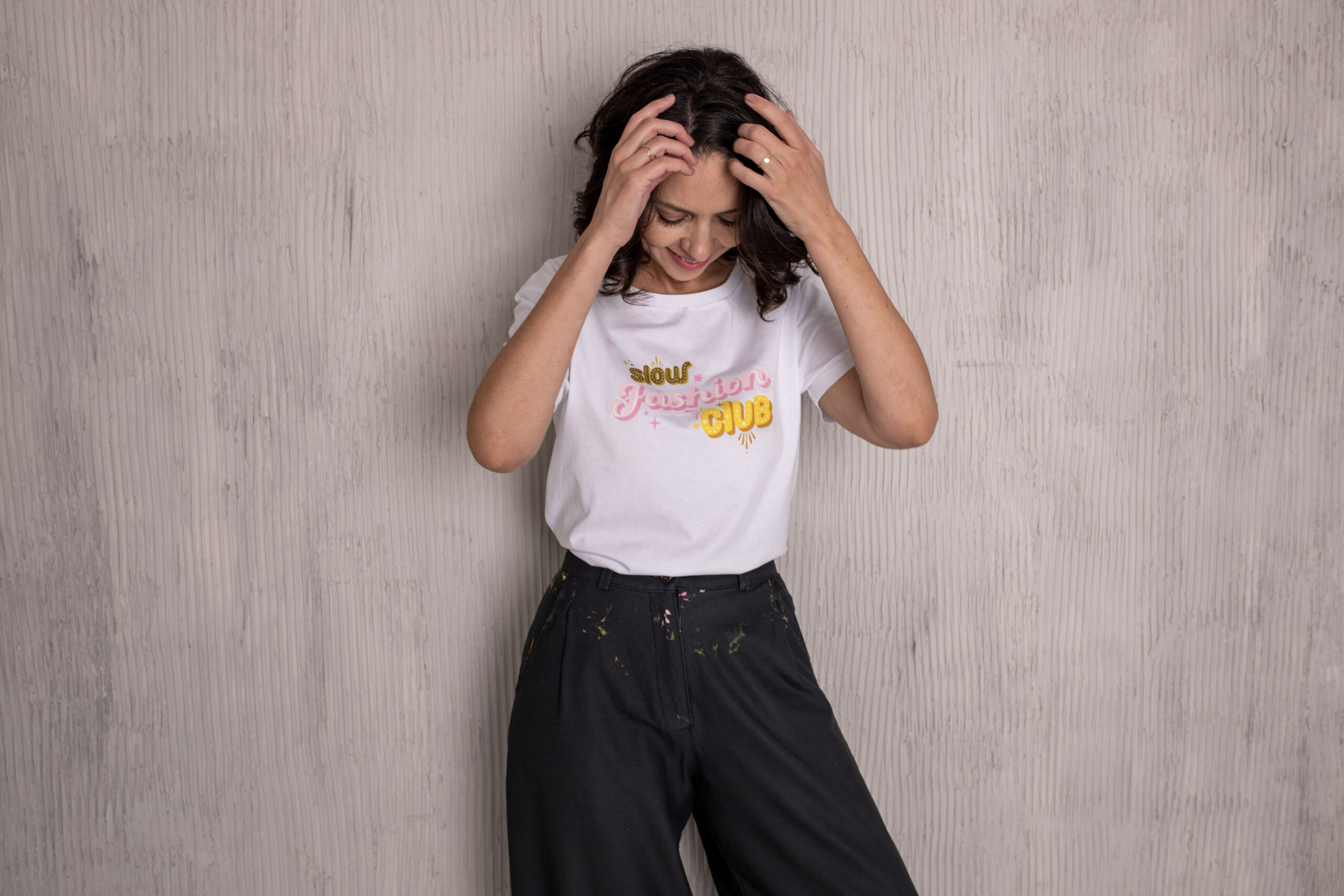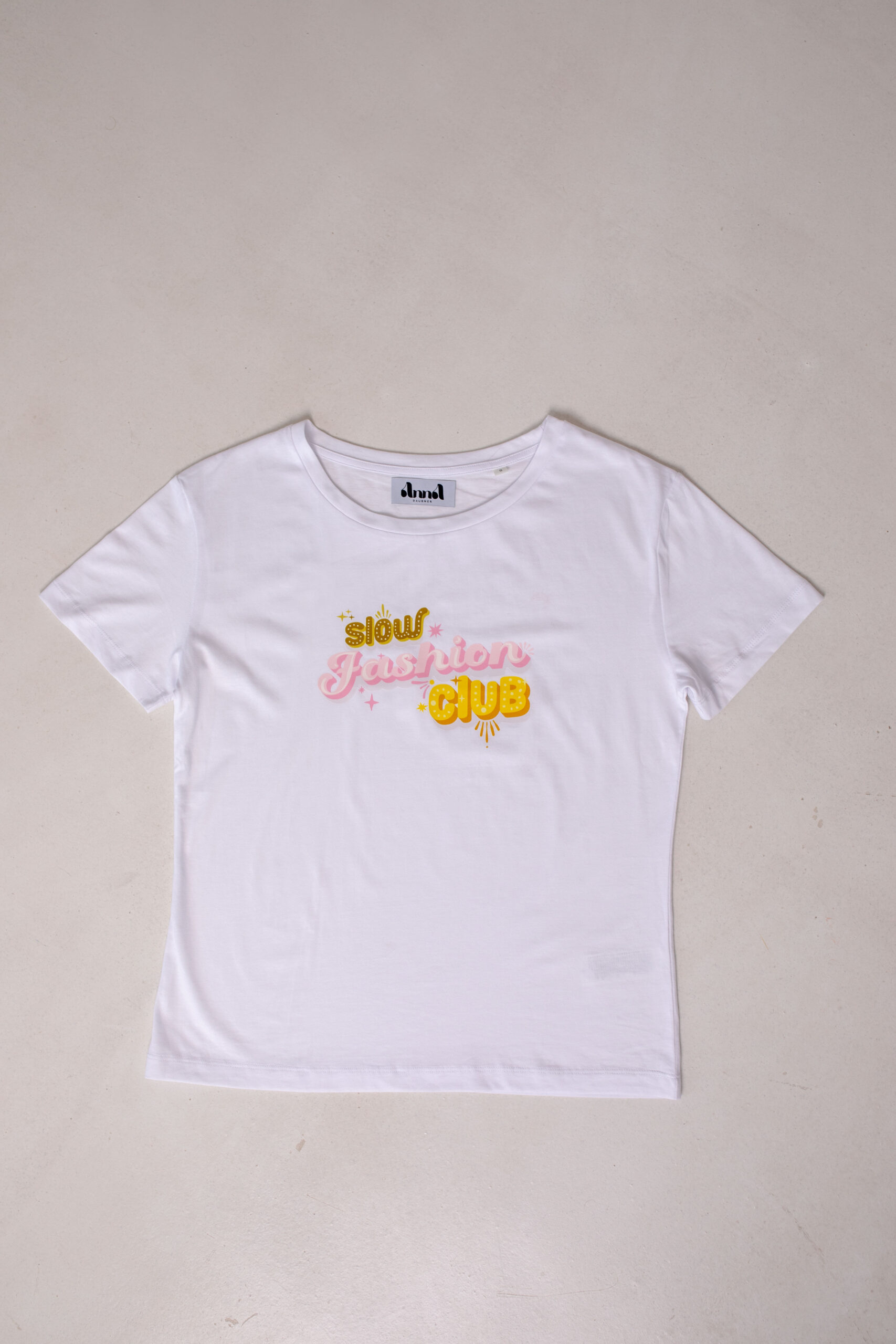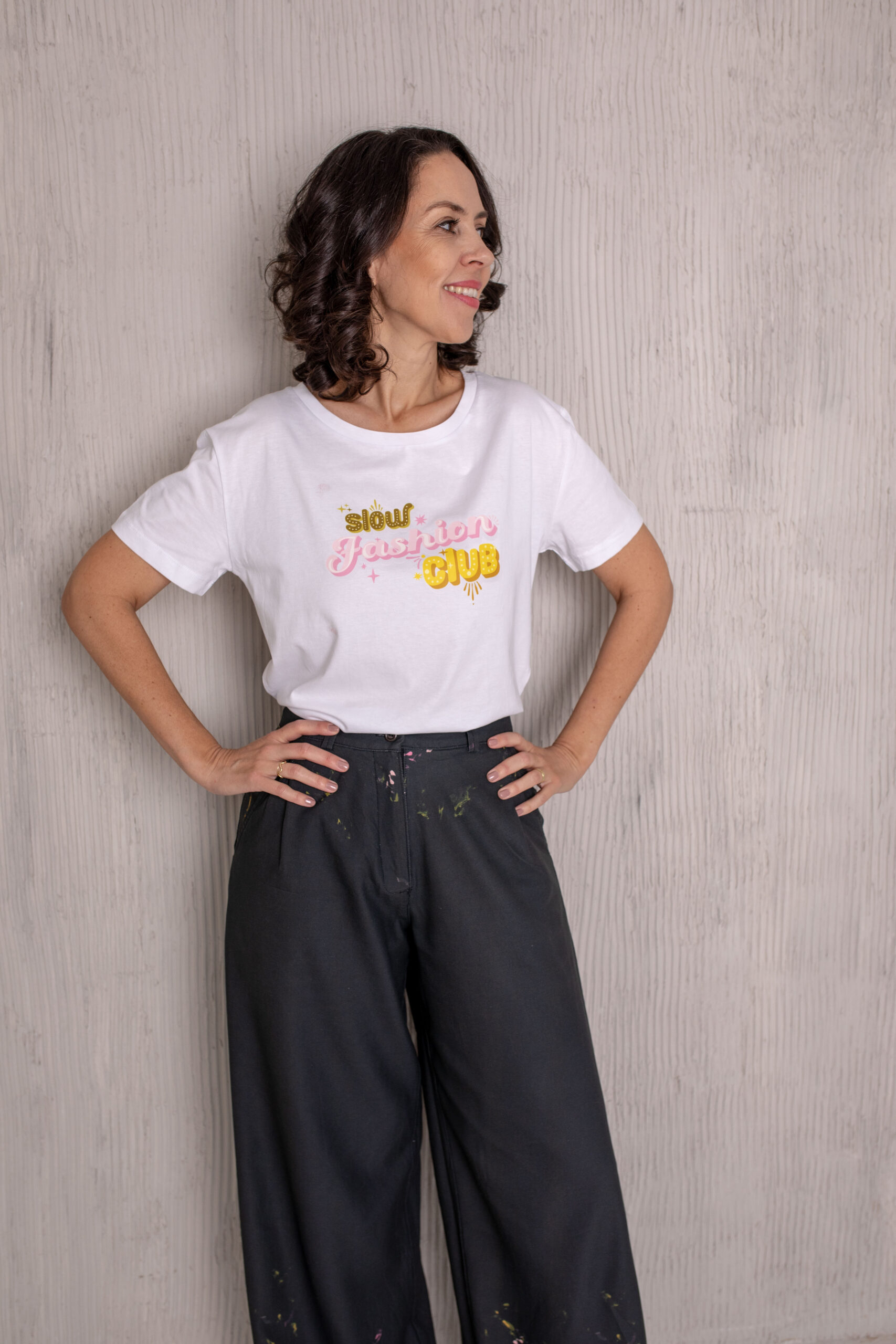 A klasszikus fehér póló, ami ezúttal a tudatos divat hirdetőtáblája lett. A Slow Fashion Club-hoz jó tartozni – a bolygónk és a saját örömünk miatt is. Ezt üzeni ez a lolly-pop ihletettségű felirat, ami színeiben is illeszkedik a teljes Ruhastory kollekcióhoz. Benne van az a felszabadultság és játékosság, ami igenis jellemzi a tudatos divatot. Lépj be te is a klubba!